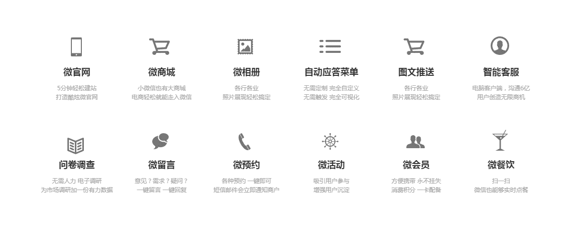 描述: 1、公司介绍:支持多级分类; 2、产品展示:产品支持多图显示,手指滑动浏览图片; 3、新闻资讯:对接微信公众平台消息推送; 4、联系方式:LBS地图位置标注,点击电话号码直接拨打; 5、信息推送:以微信官方规定的消息推送为标准。